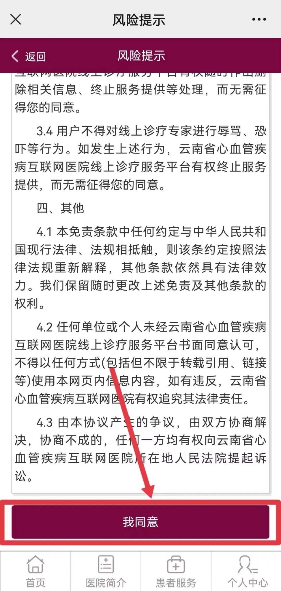 ②進入頁面仔細閱讀互聯(lián)網(wǎng)診療風(fēng)險告知及知情同意書并點擊“我同意”,進入就診人選擇頁面“綁定新就診人”。