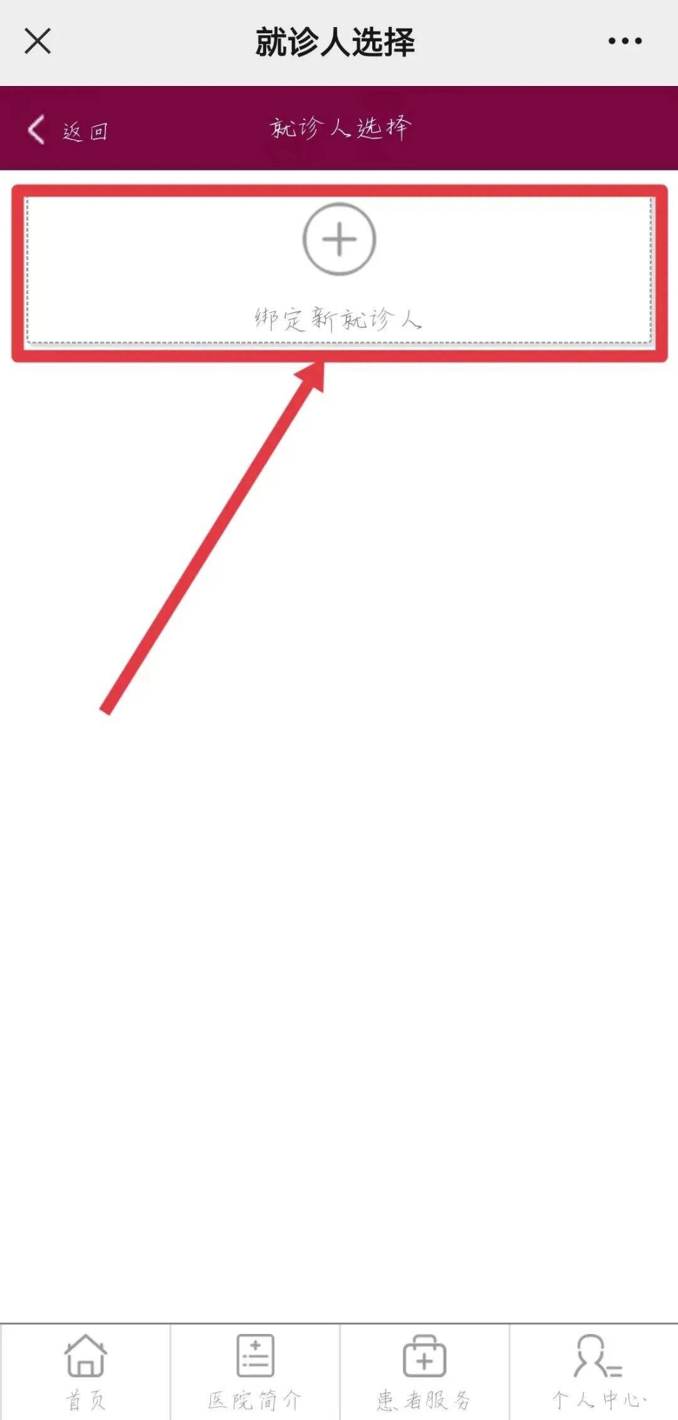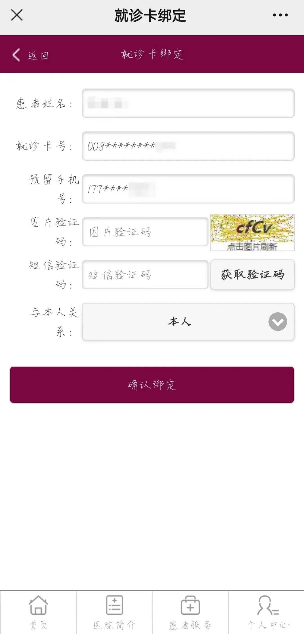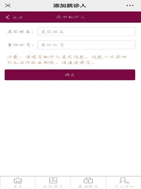 ③添加就診人填寫就診人相關(guān)信息,進入就診卡綁定頁面驗證就診人信息,核對并確認綁定。
