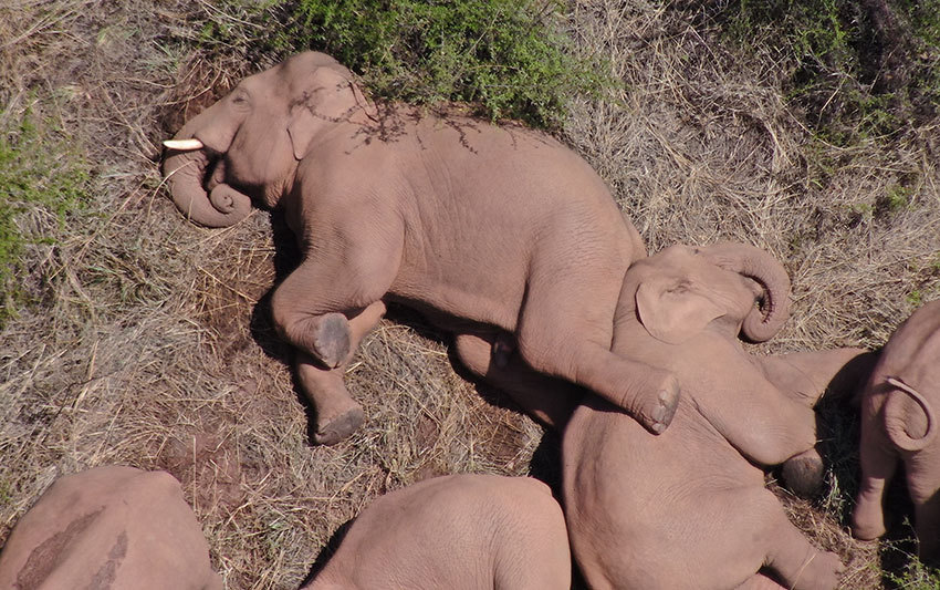 2021年6月9日10時24分,北上南歸象群在云南省玉溪市易門縣扒河附近睡覺。云南省森林消防總隊(duì)供圖