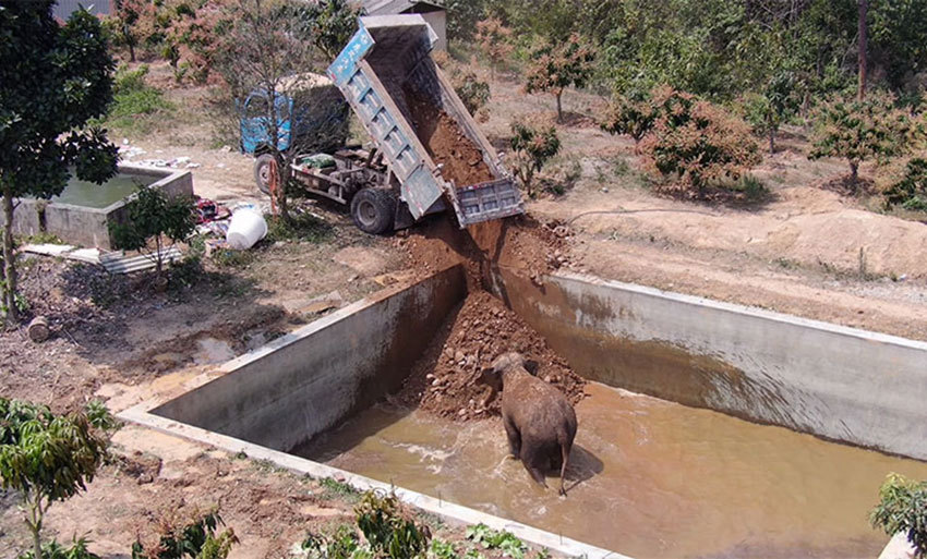 野生亞洲象誤入水池,人們填土救護(hù)。視頻截圖