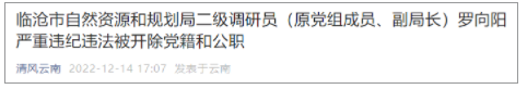 12月14日,據(jù)臨滄市紀(jì)委監(jiān)委消息:日前,經(jīng)臨滄市委批準(zhǔn),臨滄市紀(jì)委監(jiān)委對(duì)臨滄市自然資源和規(guī)劃局二級(jí)調(diào)研員(原黨組成員、副局長(zhǎng))羅向陽(yáng)嚴(yán)重違紀(jì)違法問(wèn)題進(jìn)行了立案審查調(diào)查。