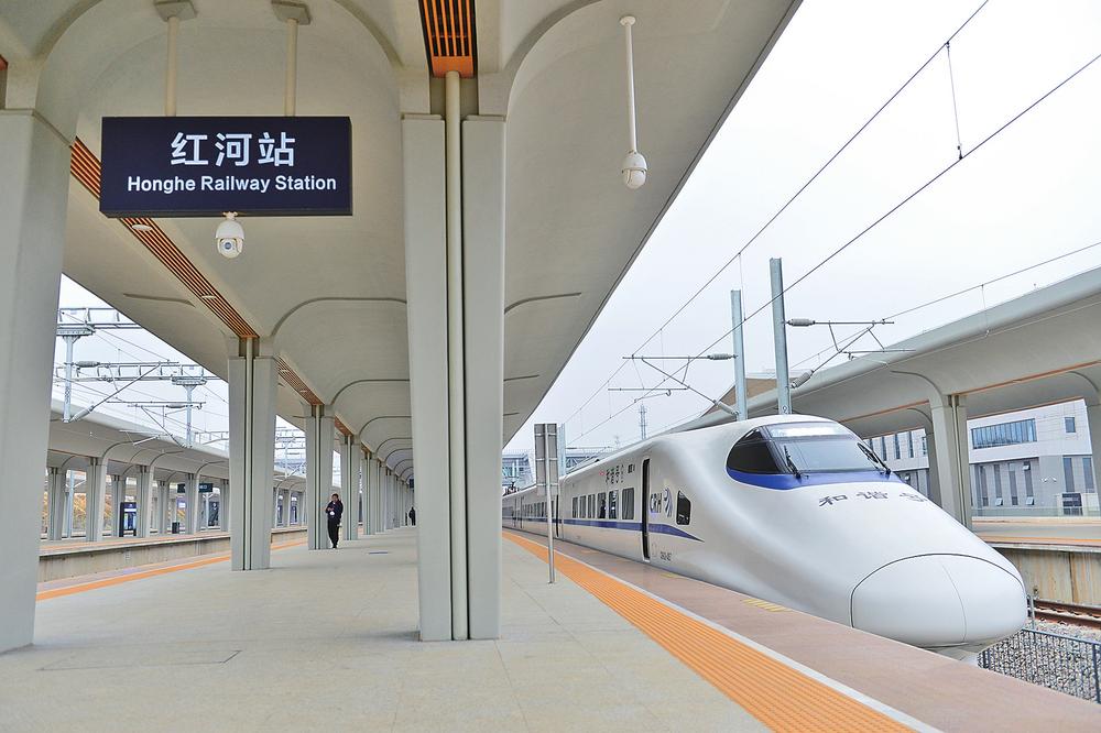 12月14日8時(shí)45分,80余名鐵路建設(shè)者和媒體記者登上昆明站開(kāi)往紅河站的試運(yùn)行動(dòng)車組,彌蒙高鐵媒體記者試乘體驗(yàn)列車的開(kāi)行,意味著彌蒙高鐵進(jìn)入正式開(kāi)通倒計(jì)時(shí)。當(dāng)天,“和諧號(hào)”奔馳不到2小時(shí)即抵達(dá)紅河站,一路上,中國(guó)鐵路昆明局昆明客運(yùn)段職工為試乘人員帶來(lái)了精彩的歌舞表演、鐵路知識(shí)問(wèn)答等活動(dòng),一路上歡聲笑語(yǔ)不斷。