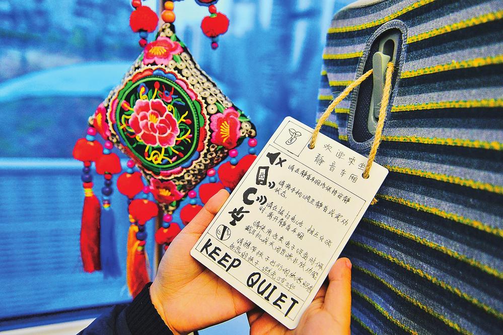 列車上有靜音車廂,這是工作人員手寫(xiě)的“保持安靜”提示卡片。