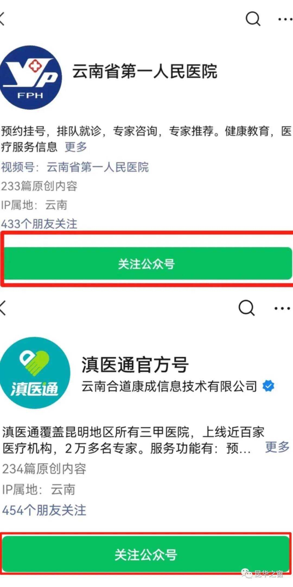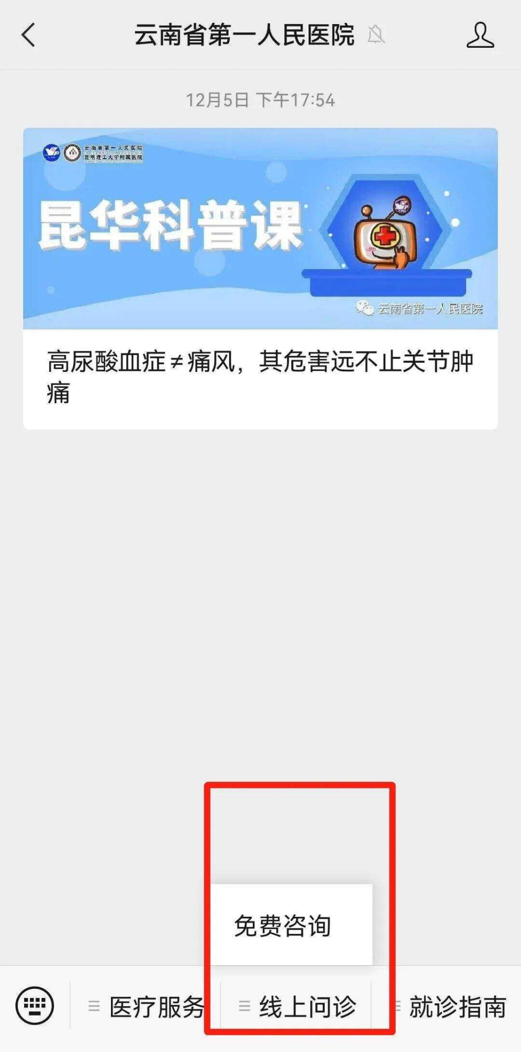 如何獲取云南省第一人民醫(yī)院門診線上免費(fèi)咨詢服務(wù)?第一步,微信搜索關(guān)注“云南省第一人民醫(yī)院”和滇醫(yī)通微信公眾號。(昆明日報全媒體記者:張曉莉)