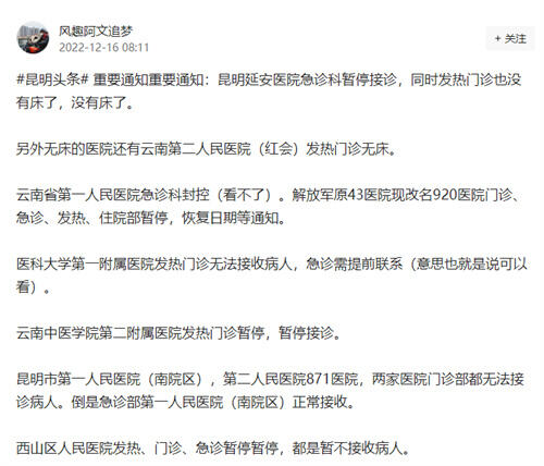 近日,網(wǎng)傳昆明部分醫(yī)院出現(xiàn)急診科暫停接診、發(fā)熱門(mén)診無(wú)床的狀況,記者對(duì)此進(jìn)行了調(diào)查走訪。