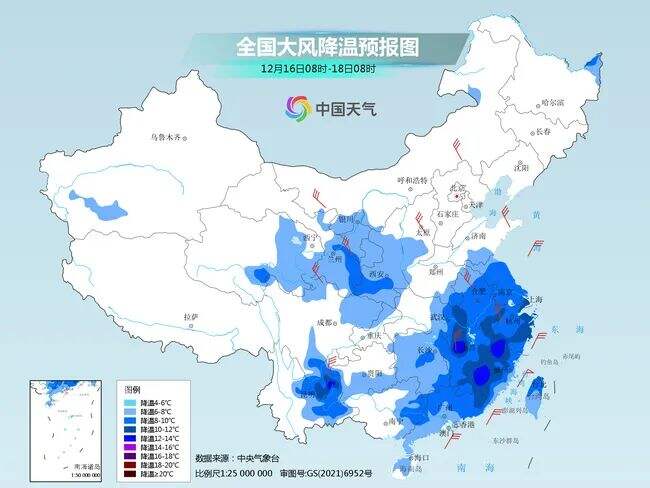 據(jù)中央氣象臺(tái)消息,12月16日至17日,中東部地區(qū)寒潮影響全面展開,18日前后,上海、浙江東部、福建東部和南部、廣東東部和南部等地的最低氣溫將接近或突破歷史同期極值,迎來同期少見的寒冷。