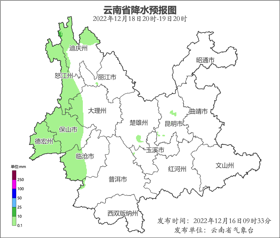 12月18日20時(shí)到12月19日20時(shí): 迪慶北部陰有小雪,怒江、大理西部、保山、德宏、臨滄西部小雨轉(zhuǎn)多云,其它地區(qū)多云轉(zhuǎn)晴。