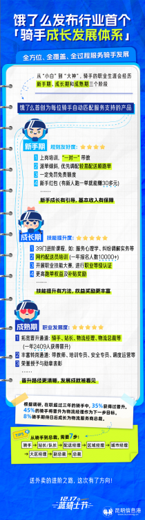 12月17日,在第五屆餓了么藍(lán)騎士節(jié)上,騎手們分享起自己的成長(zhǎng)之路。過(guò)去一年,2409名騎手晉升至站長(zhǎng)及更高崗位,其中285人成為物流經(jīng)理。當(dāng)天,餓了么發(fā)布行業(yè)首個(gè)“騎手成長(zhǎng)發(fā)展體系”,為騎手不同成長(zhǎng)周期提供支持產(chǎn)品,全方位、全覆蓋、全過(guò)程服務(wù)騎手發(fā)展。