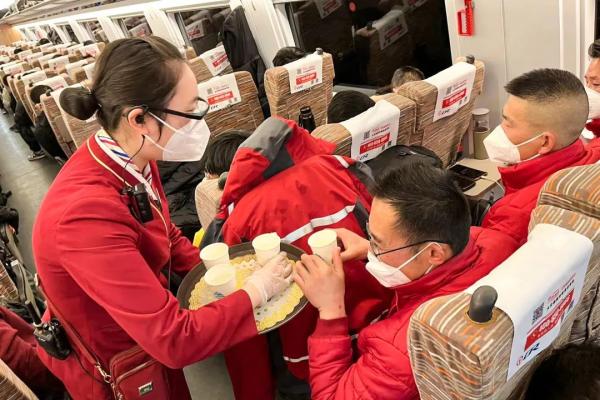 在g58次列車上,列車長胡怡文聽聞快遞小哥們乘坐本趟列車進(jìn)京,便安排乘務(wù)員第一時間為他們送上熱水。
