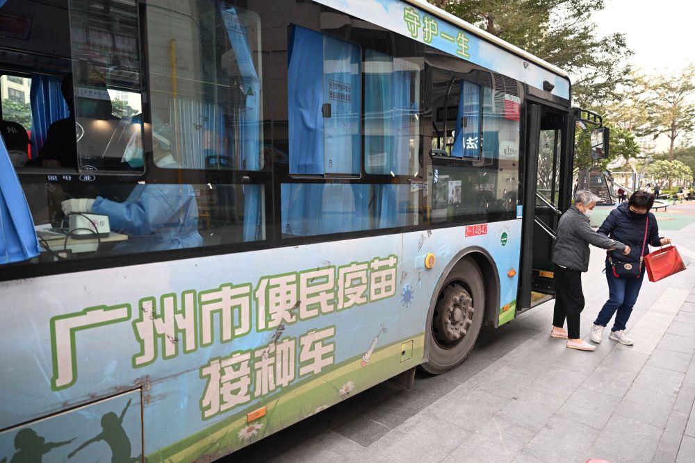 12月12日,在廣州市荔灣區(qū)廣鋼新城,老年居民在接種新冠疫苗后走下便民接種車。新華社記者 鄧華 攝