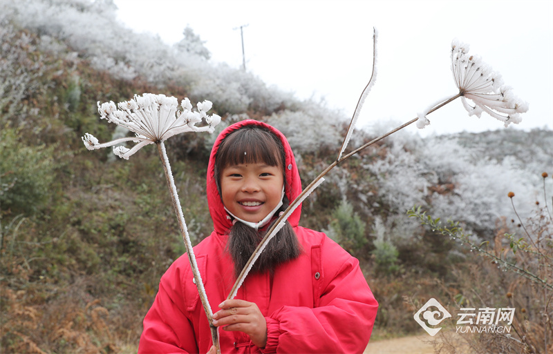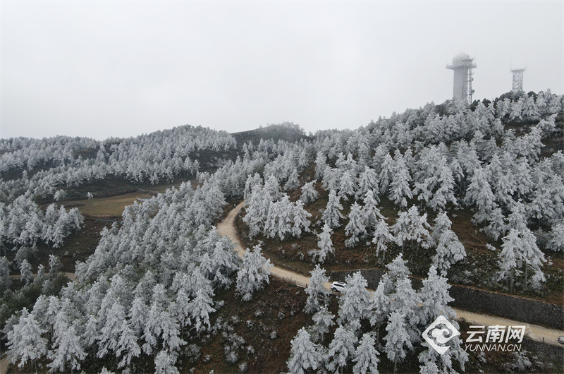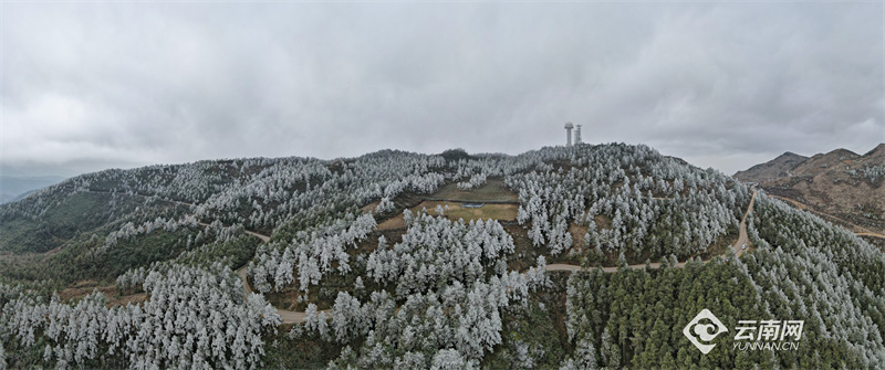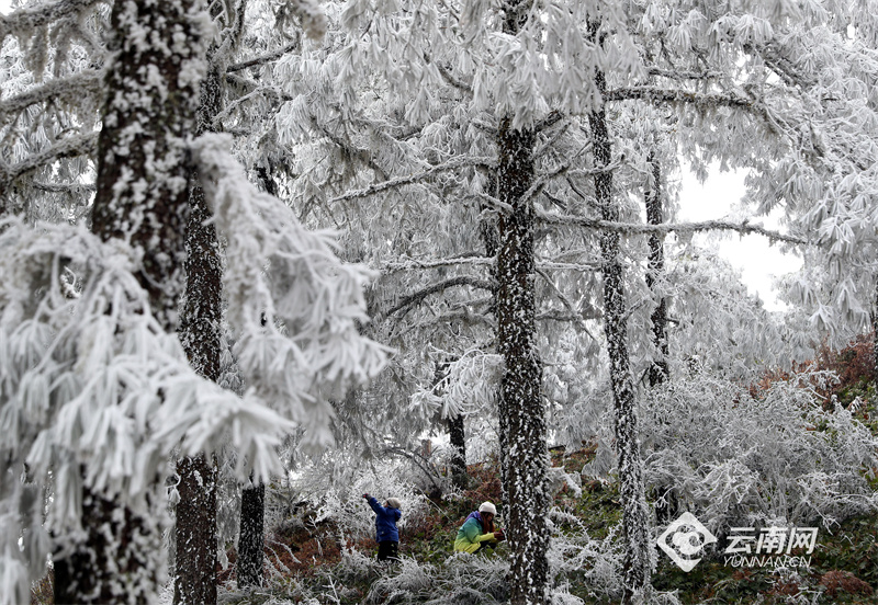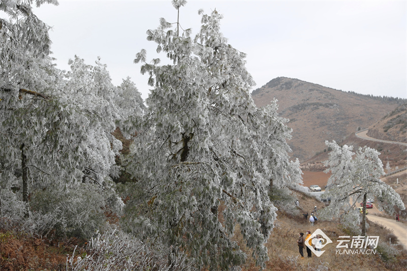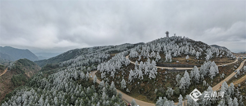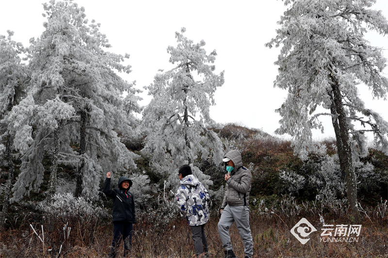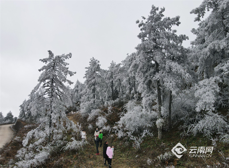 位于昆明呈貢與澄江之間的梁王山上因?yàn)榻禍爻霈F(xiàn)霧凇美景,云霧繚繞的山間,樹木銀裝素裹、霧凇晶瑩剔透,隨著草木形狀呈現(xiàn)出各種各樣美麗的造型。獨(dú)特的霧凇奇觀吸引來(lái)了大批市民涌上梁王山,近距離一睹這冬日別樣的冰雪“童話世界”。