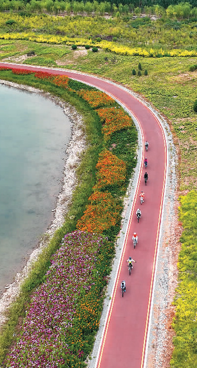 在甘肅省張掖奧林匹克森林公園,騎行愛好者在湖畔綠道上運(yùn)動(dòng)。
