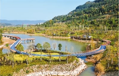 在四川省巴中市通江縣高明湖濕地公園,彩色步道、生態(tài)水系與景觀樹木相映成趣。