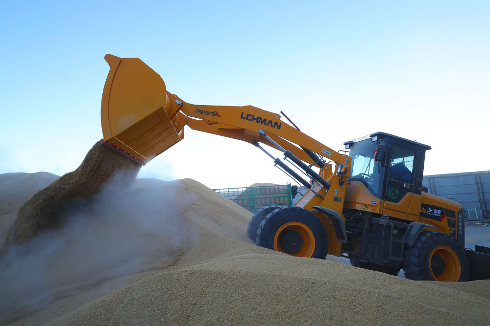 在沈陽遼北七星米業(yè)有限公司,工作人員駕駛鏟車對收購的水稻進(jìn)行攢堆(2022年10月18日攝)。新華社記者 楊青 攝