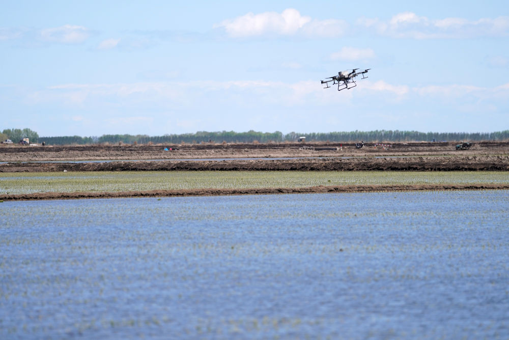 無人機(jī)在北大荒集團(tuán)七星農(nóng)場有限公司一塊稻田中作業(yè)(2022年5月18日攝)。新華社記者 王建威 攝