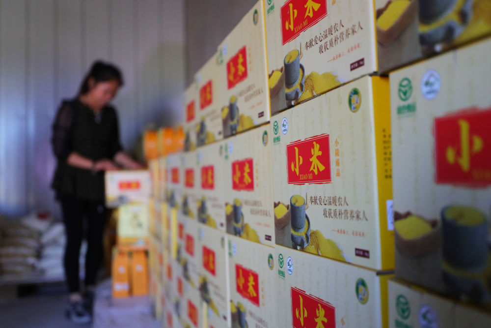 在沈陽市康平縣方家屯鎮(zhèn)東小陵村,農(nóng)民將封裝好的小米裝箱(2022年9月21日攝)。新華社記者 楊青 攝