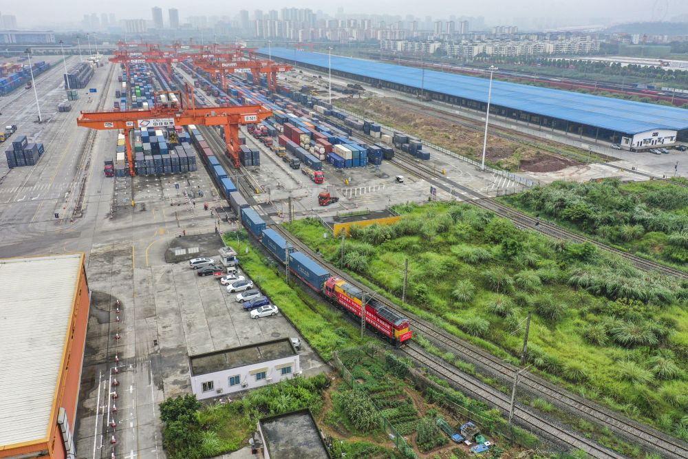 中歐班列(重慶)第10000列列車在重慶團結村中心站順利駛出(2022年6月23日攝,無人機照片)。新華社記者 黃偉 攝