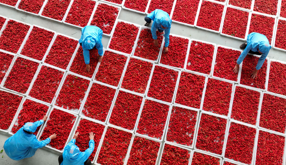 陜西省商洛市洛南縣煜正中藥材專業(yè)合作社的員工在晾曬新采摘的五味子(2022年8月21日攝,無人機照片)。新華社記者 陶明 攝