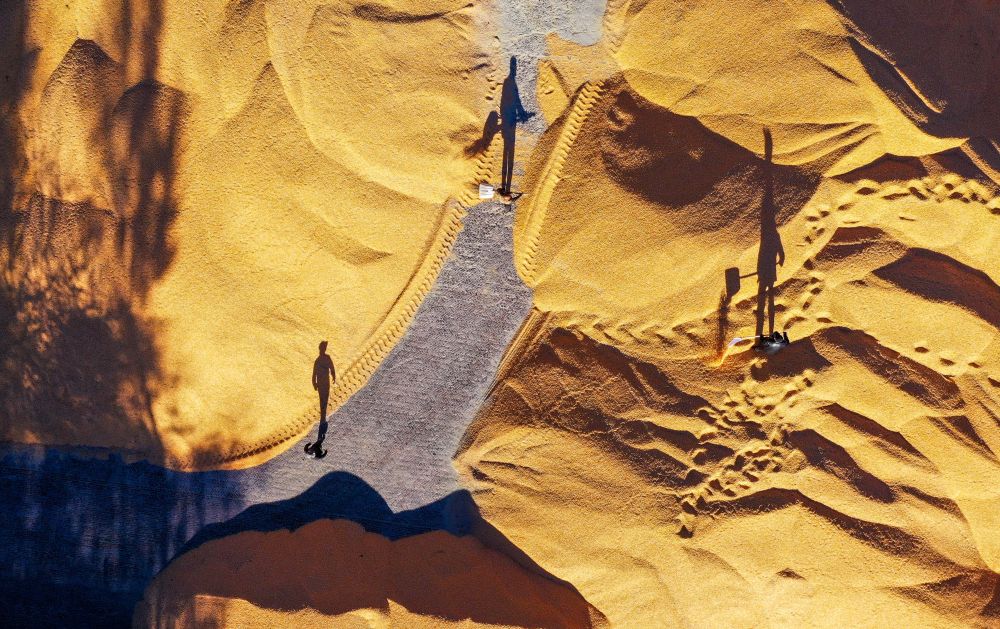 在內蒙古通遼市奈曼旗新鎮(zhèn)舍布日圖嘎查,工人在收糧站晾曬玉米(2022年10月18日攝,無人機照片)。新華社記者 連振 攝