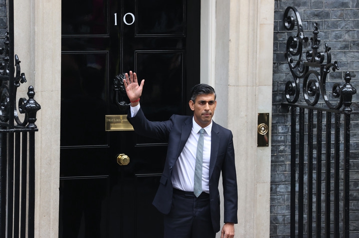10月25日,新就任的英國首相里希·蘇納克發(fā)表講話后在倫敦唐寧街10號的首相府前揮手致意。新華社記者李穎攝