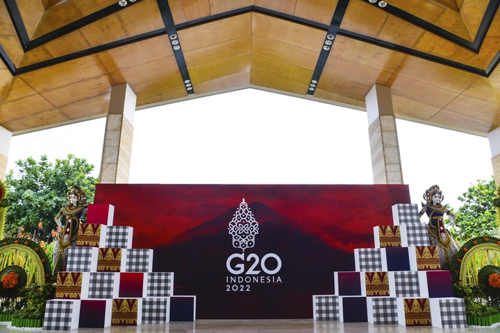 這是11月11日在印度尼西亞巴厘島拍攝的二十國集團領(lǐng)導人第十七次峰會會場外的標識。新華社記者徐欽攝