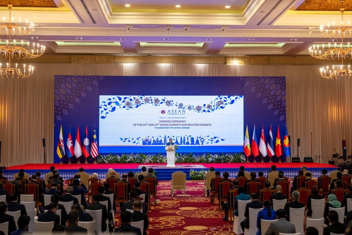 11月11日,在柬埔寨首都金邊,柬埔寨首相洪森在第40屆和第41屆東盟峰會開幕式上致辭。新華社記者朱煒攝