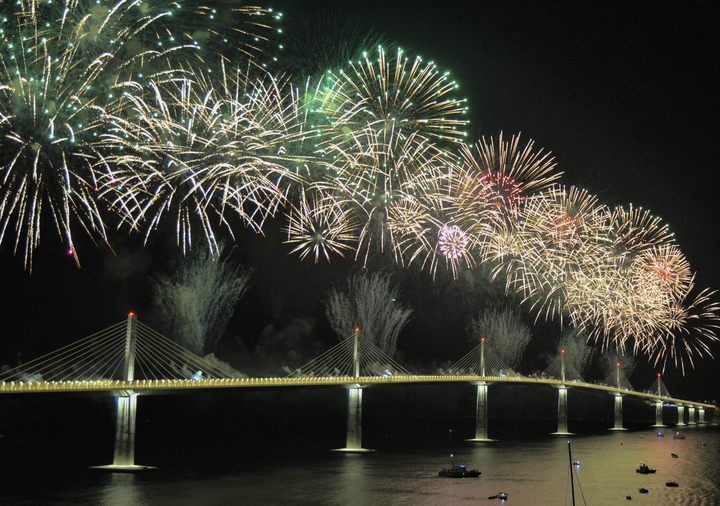 這是7月26日在克羅地亞科馬爾納拍攝的由中企承建的佩列沙茨大橋通車儀式上的焰火表演。新華社記者李學軍攝