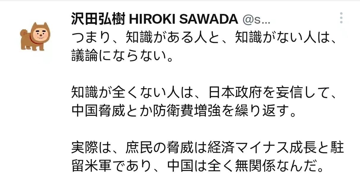 網(wǎng)友@HIROKI表示,總之,有知識的人是不會和沒有知識的人爭論的。完全沒有知識的人才會盲目信任日本政府反復(fù)渲染的中國威脅。事實上,真正對老百姓構(gòu)成威脅的是經(jīng)濟負(fù)增長和駐日美軍,與中國完全沒有關(guān)系。