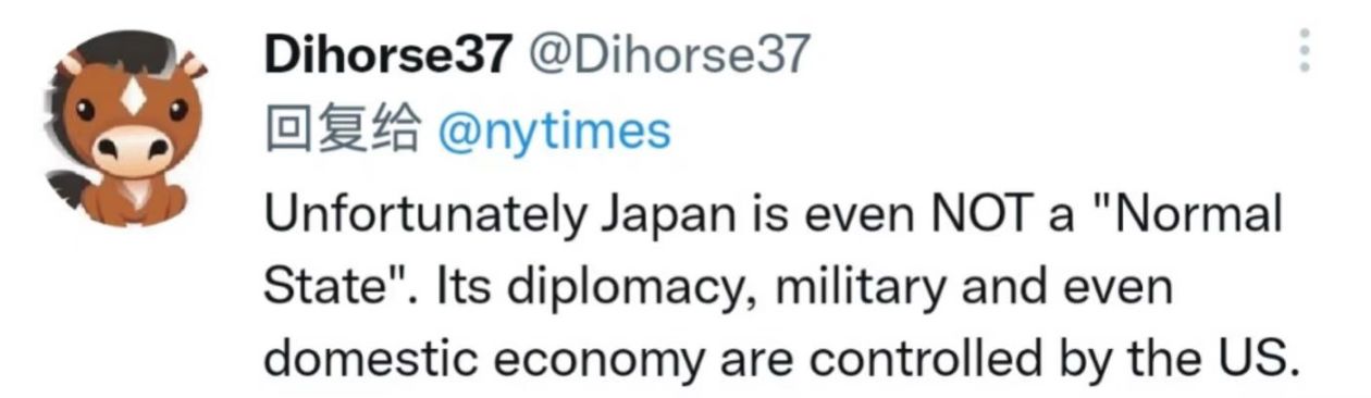 網(wǎng)友@Dihorse37表示,不幸的是,日本甚至不是一個“正常國家”。它的外交、軍事甚至國內(nèi)經(jīng)濟都由美國控制。