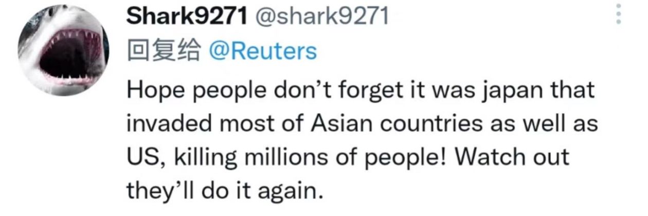網(wǎng)友@Shark9271表示,希望人們不要忘記是日本入侵了亞洲國家,并殺害了很多人!小心他們會再次這樣做。