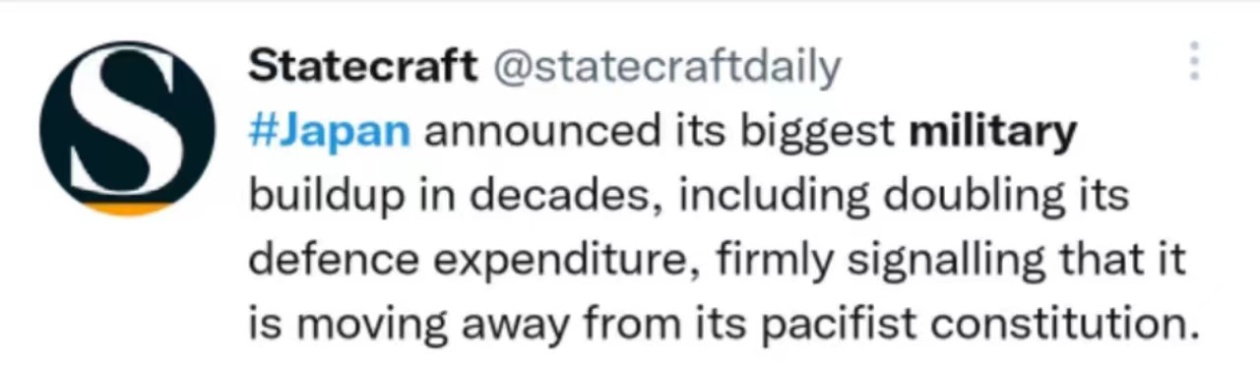網(wǎng)友@statecraftdaily表示,日本宣布了數(shù)十年來最大規(guī)模的軍事建設(shè),包括要將國防開支增加一倍,這表明日本正在背離其和平憲法。