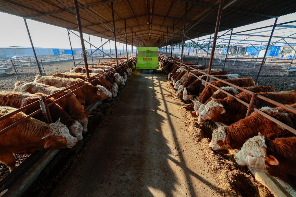 12月19日,董樹閣駕駛投料機(jī)在牛棚喂食肉牛。(受訪單位供圖)