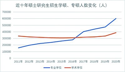 在相關(guān)政策的推動(dòng)下,碩士研究生招生總?cè)藬?shù)中,專碩招生人數(shù)增長明顯。2017年起,專碩招生人數(shù)突破40萬,首次超過學(xué)碩招生人數(shù)。到2020年專碩招生人數(shù)超過60萬人,并與學(xué)碩招生人數(shù)之間差距逐漸拉大。
