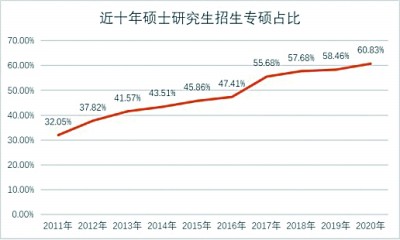 近十年碩士研究生招生中,專碩占比逐年提升,2020年占比超過60%。