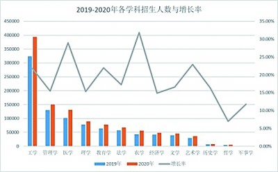 2020年研究生招生總量較上一年增長20.73%。從各學(xué)科增長率方面看,農(nóng)學(xué)是增長率最高的學(xué)科,達(dá)到了31.85%。其次是醫(yī)學(xué),招生人數(shù)增長率達(dá)到了29%。