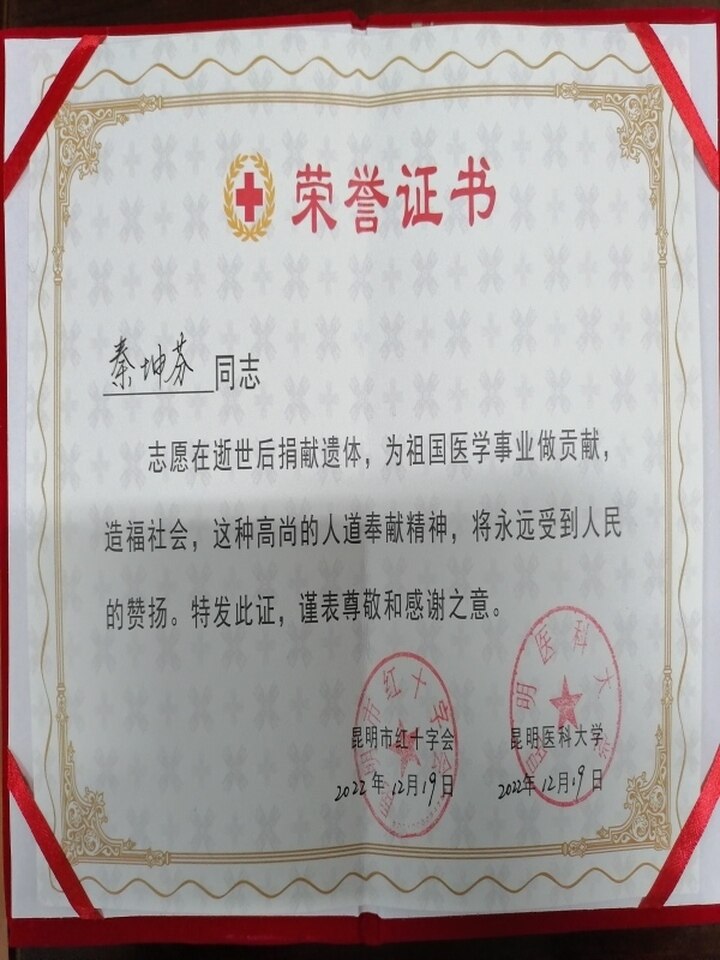 秦坤芬一生樂于助人,善良又富有愛心,她生前是云南省曲靖化學工業(yè)有限公司退休工人,她在2017年3月1日申請成為曲靖市紅十字會會員、志愿者,2018年4月28日登記成為遺體、器官捐獻志愿者,并長期參加紅十字會各類志愿服務活動,曾獲得云南省紅十字會授予的“銅蒲公英徽章”和市紅會授予的“優(yōu)秀志愿者”表彰。