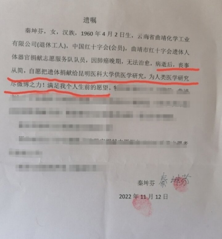 “病逝后,喪事從簡,自愿把遺體捐獻給昆明醫(yī)科大學供醫(yī)學研究,為人類醫(yī)學研究盡微博之力!滿足我個人生前的愿望”,在生命的最后時間里,她立下了這樣的遺囑,并再三囑咐女兒一定要完成她的心愿。秦坤芬雖然離開了人世,但她的善良與美好留在了人間,她的遺體成為了昆明醫(yī)科大學的“無語良師”,她無私奉獻的精神將永遠活在大家的心中。(黃瓊院 桂秋月)