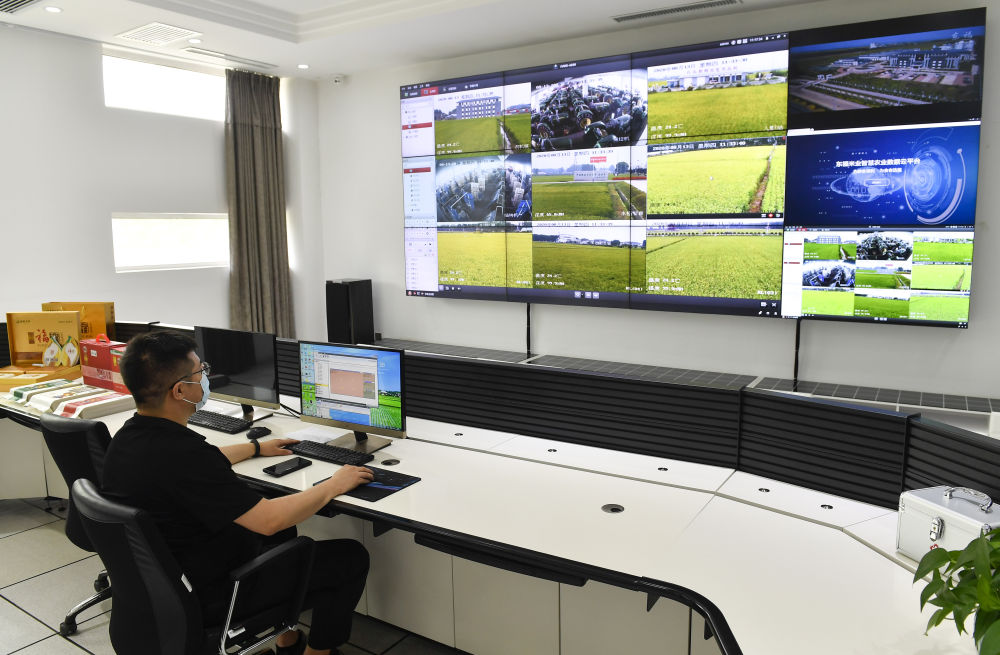 在吉林市孤店子鎮(zhèn)東福米業(yè)現(xiàn)代農(nóng)業(yè)信息化監(jiān)視指控中心,工作人員通過監(jiān)控系統(tǒng)查看稻田情況(2020年8月13日攝)。新華社記者 許暢 攝