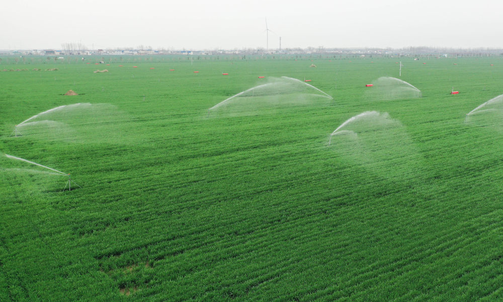 在河南省周口市商水縣張莊鄉(xiāng)高標(biāo)準(zhǔn)農(nóng)田示范區(qū),水肥一體機(jī)在為麥田澆灌(2022年3月22日攝,無人機(jī)照片)。新華社記者 張浩然 攝