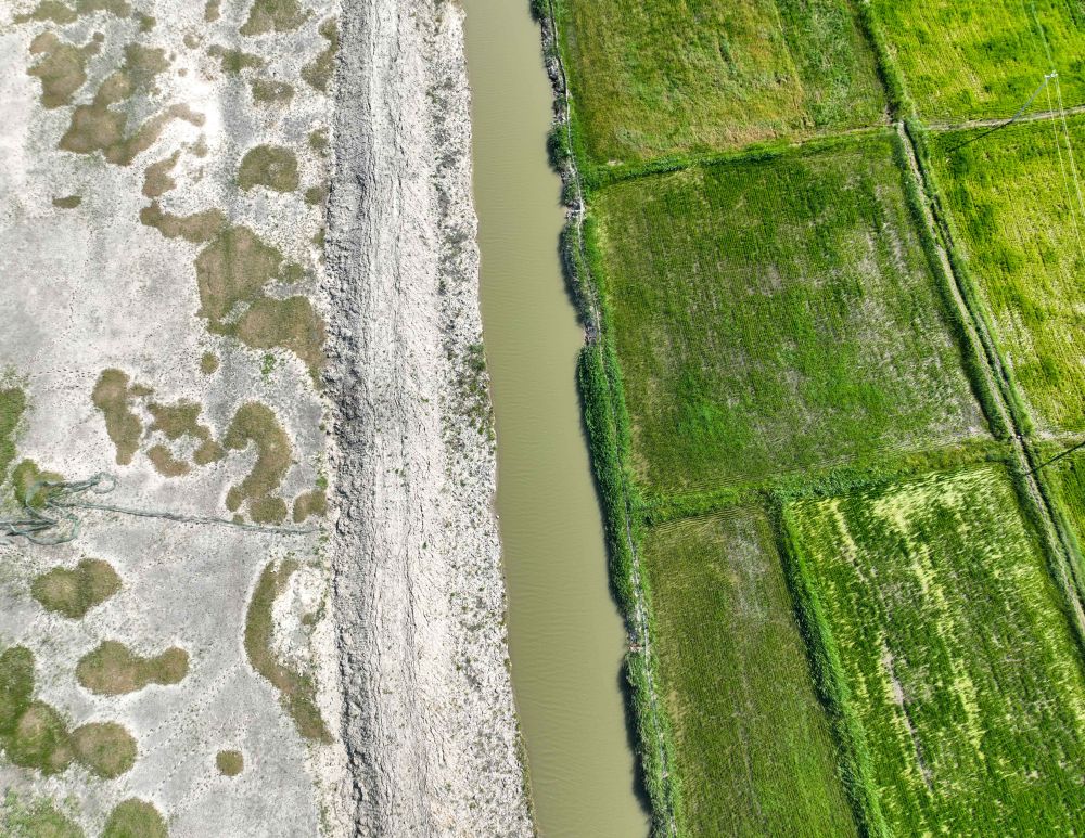 這是2022年7月12日拍攝的吉林省白城市鎮(zhèn)賚縣的稻田(右)與鹽堿灘涂(無人機(jī)照片)。新華社發(fā)(潘晟昱 攝)