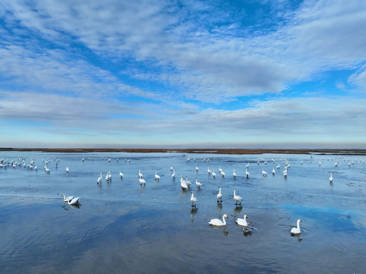 吉林省白城市鎮(zhèn)賚縣莫莫格濕地迎來大批候鳥(無人機(jī)照片,2022年11月6日攝)。新華社發(fā)(潘晟昱 攝)