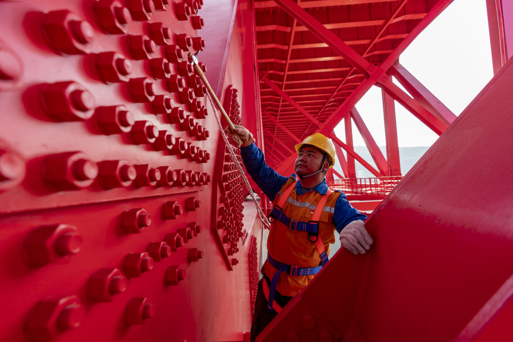 ↑ 1月18日,昆明鐵路局普洱基礎(chǔ)設(shè)施段工務(wù)維修技術(shù)中心的橋隧工施鵬彬在檢查中老鐵路控制性工程元江雙線特大橋螺絲松緊情況。新華社記者 陳欣波 攝
