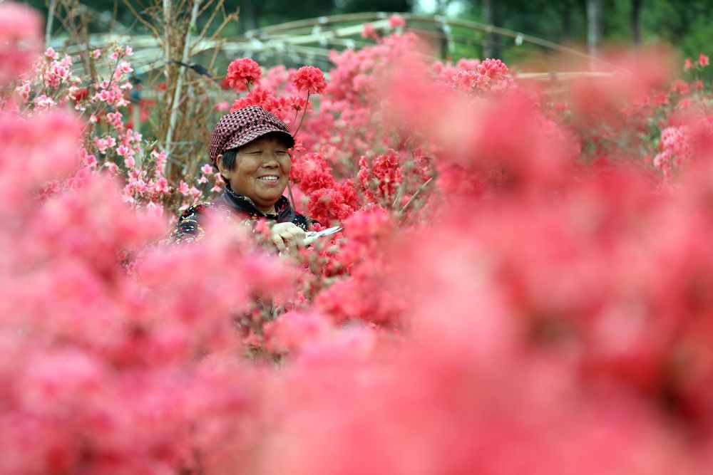 ↑ 4月29日,在石家莊市藁城區(qū)南董鎮(zhèn)南洼村一處花卉苗木基地,工作人員在修剪花卉。新華社記者 駱學(xué)峰 攝