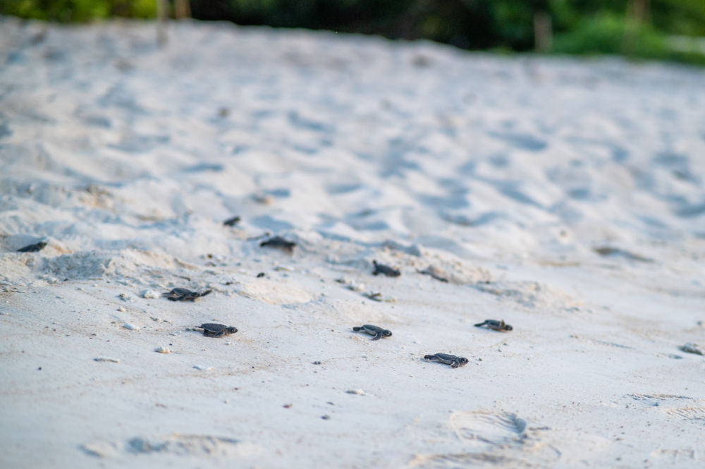 ↑ 6月14日,在馬來西亞丁加奴州熱浪島北部査加爾瑚棠海龜保護(hù)區(qū),小海龜們奔赴大海。新華社記者 朱煒 攝