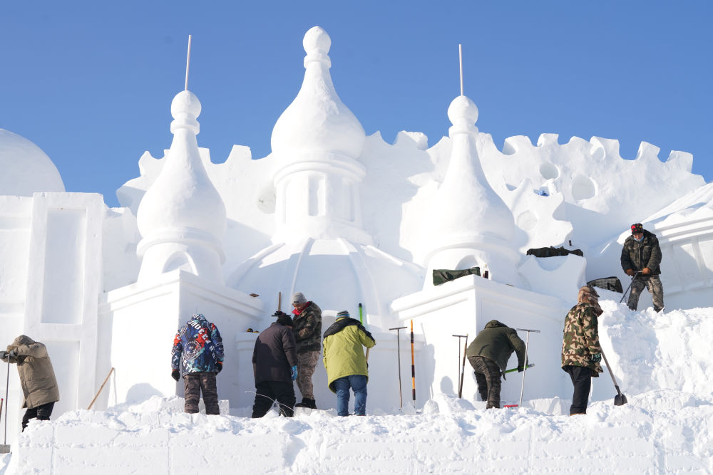 ↑ 12月18日,雕刻師在哈爾濱太陽島國際雪雕藝術(shù)博覽會園內(nèi)進(jìn)行大型雪塑創(chuàng)作。新華社記者 王松 攝