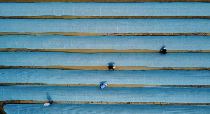 ↑ 4月26日,村民在貴州省黔東南苗族侗族自治州臺江縣臺盤鄉(xiāng)陽芳村水稻育秧基地管護(hù)水稻秧苗(無人機(jī)照片)。新華社發(fā)(余天英攝)