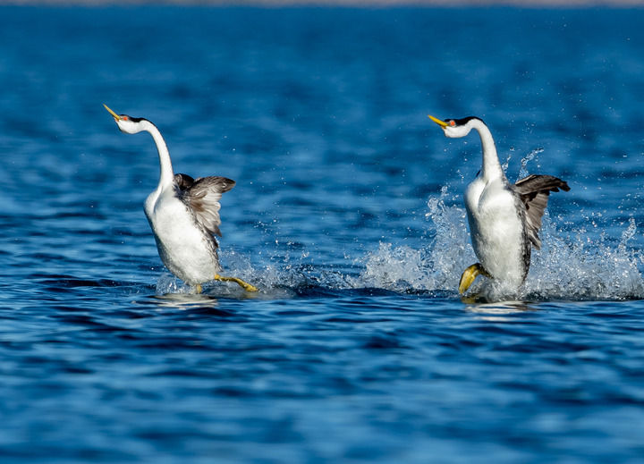 ↑ 3月8日,在美國加州圣何塞南部一個(gè)公園,??在水面起舞。新華社發(fā)(董旭東攝)