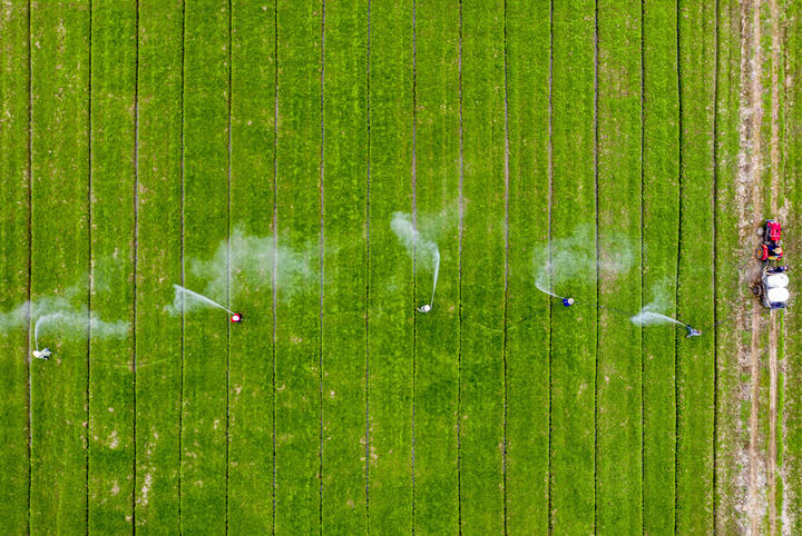 ↑ 2月16日,安徽省廬江縣白湖鎮(zhèn)農(nóng)民在進(jìn)行小麥病蟲害防治作業(yè)(無人機(jī)照片)。新華社發(fā)(左學(xué)長攝)