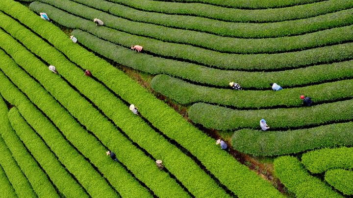 ↑ 4月15日,茶農(nóng)在武夷山市星村鎮(zhèn)的茶山上采摘新茶(無人機(jī)照片)。新華社發(fā)(陳穎攝)