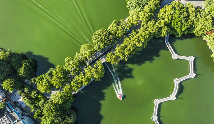 ↑ 10月3日,游客乘船游覽廣西桂林市桂湖(無人機(jī)照片)。新華社發(fā)(劉崢攝)